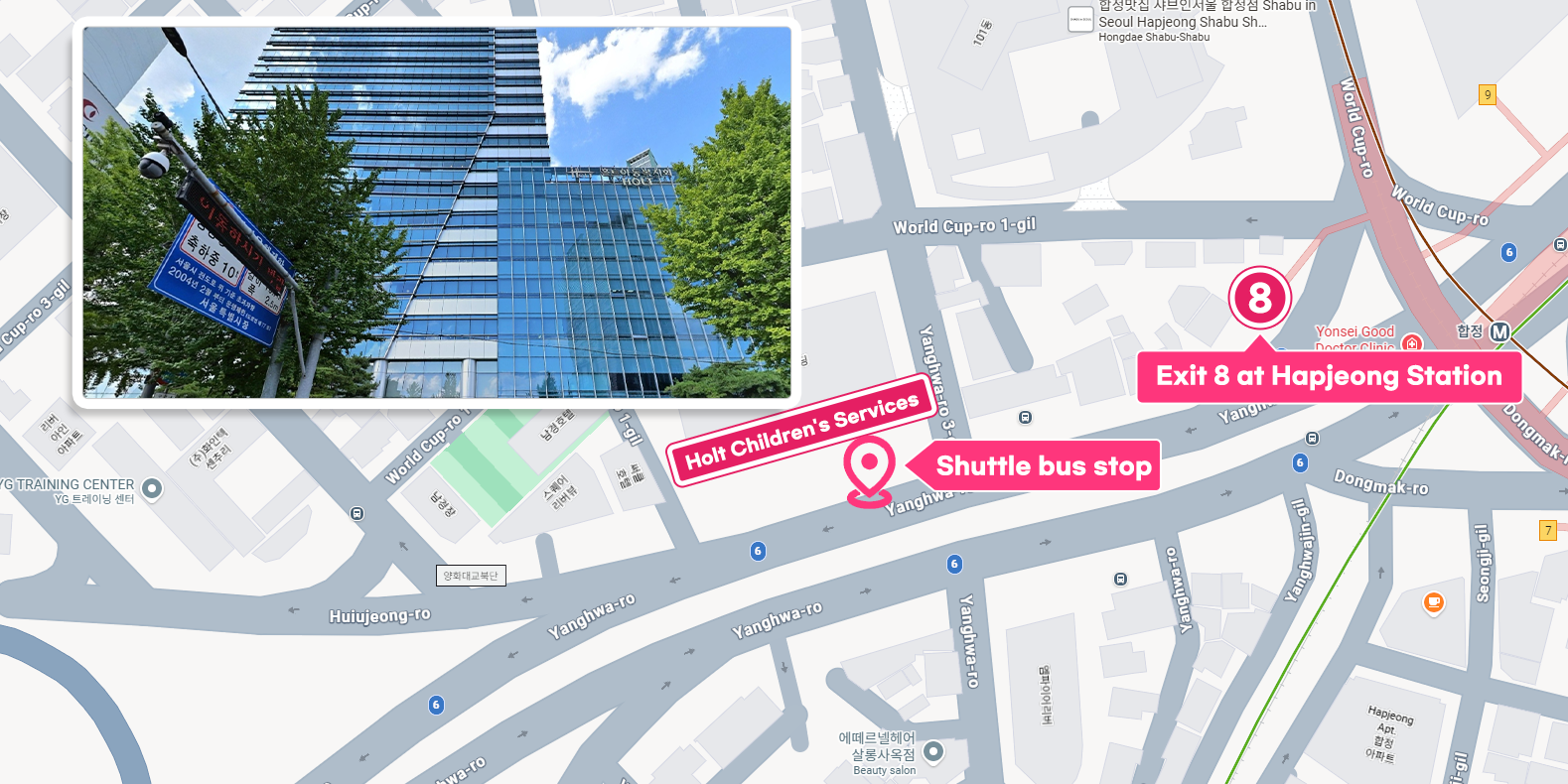 Exit 8, 120m from the main entrance of HOLT Children’s Services building.